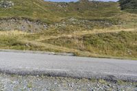 a motorcycle parked on a small mountain side road near mountains with no cars driving on it