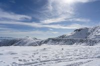 A snowy mountain landscape in Italy. Skiers leave tracks and traces on the glacial slopes. The surface is frozen, creating a highland garden. Clouds float above, adding to the breathtaking nature of this European road.