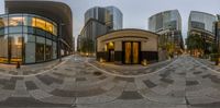 A straight road in Tokyo's bustling city, with modern architecture and street lights illuminating the night. The business district comes alive as dawn breaks, filling restaurants and storefronts.