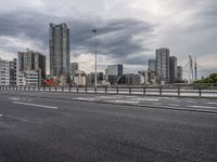 Modern urban cityscape of Tokyo, Japan at dawn. Grey sky hovers over the asphalt roads lined with Armco barriers. The skyline showcases modern architecture of the city.