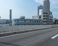 the highway is empty as it runs into the city's skyline area with a building on the other side