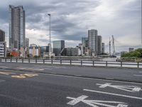 Modern urban cityscape of Tokyo, Japan at dawn, with a grey sky backdrop. Asphalt roads lined with Armco barriers lead to bridges and modern architecture. The skyline highlights the blend of traditional and contemporary Japan.