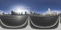 multiple shots of an empty highway with a city skyline in the background in a fish eye view lens