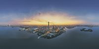 Aerial view of a modern metropolis in Jiangsu, China, with a stunning sunset reflecting on the lake. The cityscape consists of high-rise skyscrapers and a captivating skyline. This emotional overlook showcases the beauty of urban Asia.