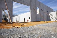 A low concrete building under construction in Johnson City, Tennessee. The rugged surface of the wall contrasts with the open space of the property. Gravel and dirt line the construction site.