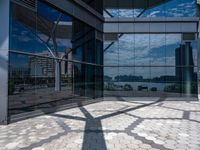 This image captures the bustling business district of Taipei, Taiwan. The tall office buildings, highlighted by the hard shadows cast on the ground, reflect the vibrant economic activities in the area. The glass windows of the buildings create a contrast against the open space in front, adding depth and dimension to the scene. This photo showcases the modernity and development of the Republic of China. A person's shadow on the sidewalk brings a human element to the otherwise business-focused environment.