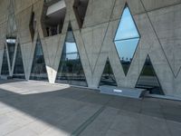 This image captures the essence of urban life in Taiwan. The architectural building, located in the city of Kaohsuing, showcases the urban design and modernity of the Republic of China. People can be seen walking through the courtyard, which is adorned with large windows and curved walls. The concrete floor reflects the hard shadows cast by the glass walls, creating a unique and visually striking surface. This photo represents the blend of art, culture, and urbanization in Taiwan.