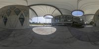 a sphere with several curved ceiling in it and an empty area next to the building