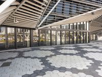 A modern architectural structure in Kaohsuing, Taiwan. The enclosed area features a walkway with hexagon tiles and large windows, offering a view of the coastal city and the ocean beyond. The futuristic design reflects the urban life of the vibrant city.