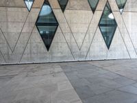 the white tiled floor is filled with some geometric shapes and windows on it's side