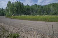 a dirt road and some green trees with tall grass and yellow flowers in front of the dirt road