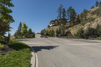A picturesque landscape in Kelowna, British Columbia. The clear sky highlights the lush greenery of the Okanagan Valley, with a winding road cutting through the scenic terrain. Residential areas dotted with evergreen trees create a peaceful rural setting.