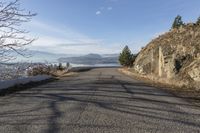 A straight road lined with conifers and rock walls in Kelowna, British Columbia. The road surface reflects the clear sky, leading towards the beautiful Okanagan Lake. A scenic day in Canada's Lake District.