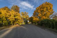 Aerial view of a straight road in Kelowna, British Columbia. The road is lined with classic architecture and deciduous trees with vibrant yellow leaves. Suburban neighborhood of Kelowna, showcasing the stunning autumn colors of the Okanagan Valley.