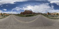 a wide angle shot of a road and mountain under blue skies with clouds and sun