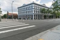 a city intersection with a building on the corner and a pedestrian crossing the street near it