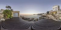 A serene scene at the lake, with a wooden dock leading to a building. The calm water reflects the azure sky and surrounding nature. Outdoor furniture provides a spot to enjoy the sunshine and peaceful atmosphere.