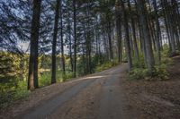 This is an image of a road surrounded by a forest in Ontario, Canada. The clear sky above highlights the deciduous trees and their long shadows on the road surface. The landscape features a mix of grass, dirt, and gravel, with vegetation lining the thoroughfare. A lake can be seen in the background, reflecting the trees and providing a serene backdrop. This photo captures a typical day in Ontario, showcasing the natural beauty of the Toronto area. The image is filled with vibrant colors, from the green grass to the autumn leaves on the trees.