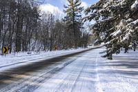 This image showcases the breathtaking landscape of Ontario, Canada. The photo was taken on a beautiful day, with clear skies and fluffy clouds. The road meanders through a dense forest and is covered with a layer of pristine snow. Trees and branches covered in snow add to the winter wonderland atmosphere. The lush vegetation and sloping terrain contribute to the natural beauty of the scene. This picture truly captures the essence of Ontario's stunning landscape. It is a perfect representation of the harmony between nature and human infrastructure.