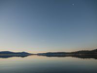 A serene landscape with a fluid horizon. Clear sky above the tree-lined lake creates a dawn-like atmosphere. Reflections on the water showcase the beauty of nature in its wet glory.