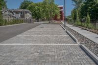 This stock photo features an urban landscape in Toronto, Ontario, Canada. The image showcases a well-designed road with a smooth asphalt surface leading to a spacious parking lot. Surrounding the road, there is a beautiful residential area with neatly lined trees and a walkway. The clear sky overhead enhances the overall scenic view. This photo represents the vibrant and modern city of Toronto, an ideal place for settling with its well-planned infrastructure and public spaces.