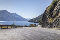 A scenic coastal road winding through the highlands, with a clear sky and ocean on one side and a rock wall on the other. Lush vegetation and mountains create a breathtaking landscape.