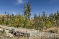 Scenic view of a dirt road winding through a picturesque landscape in the Okanagan Valley, British Columbia, Canada. The image captures the beauty of the natural surroundings with its lush green grass, tall trees, and evergreen vegetation. In the distance, a majestic mountain range can be seen, complementing the clear blue sky above. A wooden bridge spans a peaceful creek, adding to the tranquil atmosphere of the scene. This photo perfectly showcases the charm and serenity of the East Kelowna region.