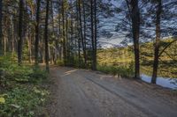 This image captures the beauty of Ontario's landscape in Canada. The road, made of asphalt and surrounded by vegetation, leads to a pristine body of water. Larch trees line the road, creating a natural canopy that adds to the serene atmosphere. The clear blue sky reflects off the calm waters, creating a stunning reflection. The forest in the distance casts a hard shadow, creating a picturesque scene. This photo represents a peaceful day in Ontario, where nature and tranquility come together.