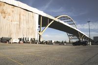 This stock photo features a large bridge spanning over a parking lot in an industrial area in Chicago, Illinois. The bridge is made of concrete and is a tied-arch bridge. It is located next to a building with a light post on top. The area around the bridge is filled with warehouses and suburban buildings. In the background, you can see the river and the coastal water. The sky is clear with a few contrails visible. The photo was taken during the day, showcasing the urban architecture and open spaces of the city.