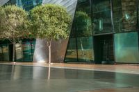 A modern architectural marvel in the heart of Los Vegas, USA. This large glass building stands tall against a beautiful urban backdrop. The sidewalk and trees create a vibrant outdoor space for shopping and city life.
