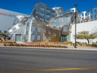 A modern silver building with a curved design stands in the heart of bustling City Life in Las Vegas. The intersection and city street scene provide a dynamic urban backdrop, showcasing the vibrant architecture and urban design of the USA.