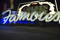 A night view of Las Vegas, Nevada, with its iconic neon lights illuminating the city. The open spaces and dark urban streets create a captivating midnight atmosphere. Neon signage and graphic lights add a touch of blue font to the city's surface.