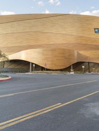 A modern architectural marvel in Las Vegas, Nevada. The facade of the building shines under the dawn light, casting shadows on the urban landscape. The composite material road surface slopes down, giving a unique urban design to the city.