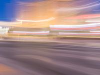 A night view of Las Vegas, Nevada showcasing its futuristic architecture and bright neon lights. The city streets, with their fast-moving cars, create a dynamic and vibrant atmosphere. The dark sky contrasts with the vibrant light streaks of the headlamps. A captivating urban landscape.