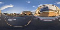 A fisheye view of the bustling streets of Las Vegas at night. Modern architecture and bright city lights create a vibrant urban atmosphere. Traffic flows on the asphalt roads, surrounded by towering buildings and illuminated billboards.
