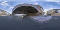 A fisheye view of a small parking garage in Las Vegas. Modern architecture and urban design are showcased against a clear sky. The time-lapse effect captures the bustling atmosphere of the city.