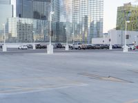 A view of a modern architecture high-rise in Las Vegas, USA. The clear sky enhances the urban design. The parking lot with parked vehicles is a part of the open space. The concrete surface and the asphalt road provide a visually appealing contrast.