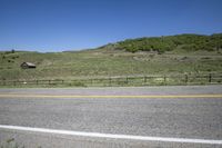A black van driving down Last Dollar Road in Telluride, Colorado. The road winds through the picturesque landscape, surrounded by mountains, forests, and lush green grass. Wooden fences and bushes line the asphalt road. A beautiful day with clear skies.