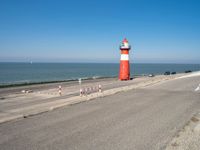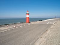 This image captures the serene coastal landscape of Holland, Netherlands. In the distance, a large lighthouse stands tall on the edge of the road, overlooking the ocean. The clear sky and open horizon create a sense of tranquility. The composition of the image showcases the beautiful natural surroundings, with the beach and water close by. The road, made of asphalt, leads towards the coastline, inviting exploration. This photo represents the coastal beauty and the rich history of Holland. It is a perfect representation of the European landscape.