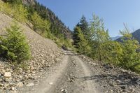 A straight view down the road in Lillooet, British Columbia. The landscape is dominated by mountains, forests, and vegetation. The road surface is a mix of asphalt and gravel, perfect for off-road adventures. Clear skies and larch trees complete the picturesque scene.