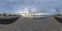 A stunning fisheye view of Lisbon's iconic bridge, spanning across the river at dawn. The cityscape is bathed in golden sunlight, reflecting off the calm waters. The azure sky adds to the picturesque atmosphere of this European coastal city.