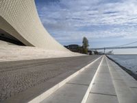 This is a photo taken in Lisbon, Portugal, showcasing the modern architecture and urban design of the city. In the foreground, the walkway is reflected with water on it, adding to the symmetrical and picturesque scene. The clear sky contrasts with the clouds above, and in the background, a big bridge can be seen spanning across the ocean. This image captures the coastal and urban beauty of Lisbon, as well as the harmonious blend of modern and traditional architecture. It represents a vibrant city life and the unique charm of the Lisbon harbor.