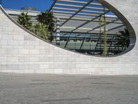 Lisbon's modern architecture reflected in a clear sky. A person riding a skateboard on cobblestone surface, with a big curved building in the background. The perfect blend of urban design and open space in Europe's capital city.