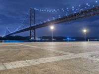 A view of Lisbon's harbor at night, illuminated by street lights and artificial light. The city can be seen in the distance, with a bridge spanning the coastal water and a jetty extending into the open ocean.