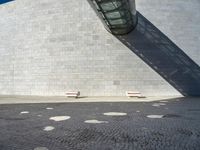 A modern architecture museum in Lisbon, Portugal. The building's design features a combination of sandstone walls, cobble stone floors, and wooden elements. The open space and grey road surface create a dynamic and inviting atmosphere.