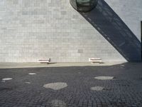 The modern architecture of a museum in Lisbon, Portugal. The sandstone walls and cobblestone floor create a stunning contrast. Two white seats provide an open space for relaxation, with a street lamp casting a hard shadow in the background.