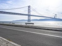 a car driving past a suspension bridge over the water next to the ocean on a sunny day