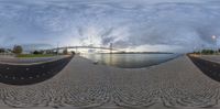 A stunning fisheye view of Lisbon, Portugal, with a bridge spanning the river. The coastal city is bathed in the afterglow of dawn, with clear blue skies reflecting in the calm waters. The road surface leads straight towards the horizon.
