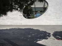 A woman walks by a modern architecture museum in Lisbon, Portugal. The building is surrounded by trees and vegetation. Round windows and sandstone walls create a unique architectural design.