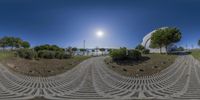 A park area in Lisbon, Portugal, with stone steps and green grass. The sun shines down, casting hard shadows and creating a serene atmosphere. The coastal landscape and clear sky add to the natural beauty of the scene.